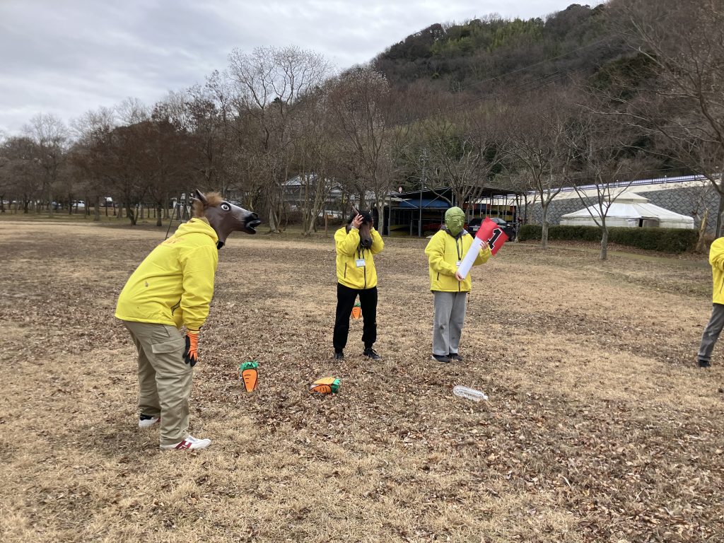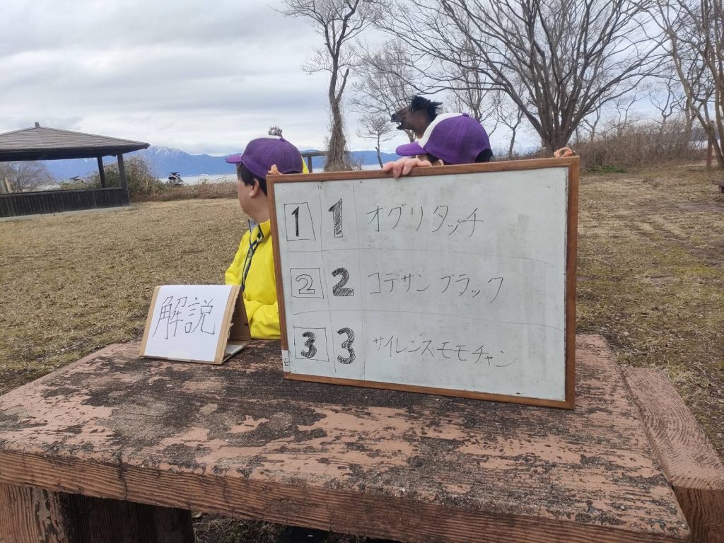馬のお面を被ったスタッフがビーチフラッグで一本勝負です🔥解説のスタッフも来て、それぞれの馬の紹介もしてくれました。