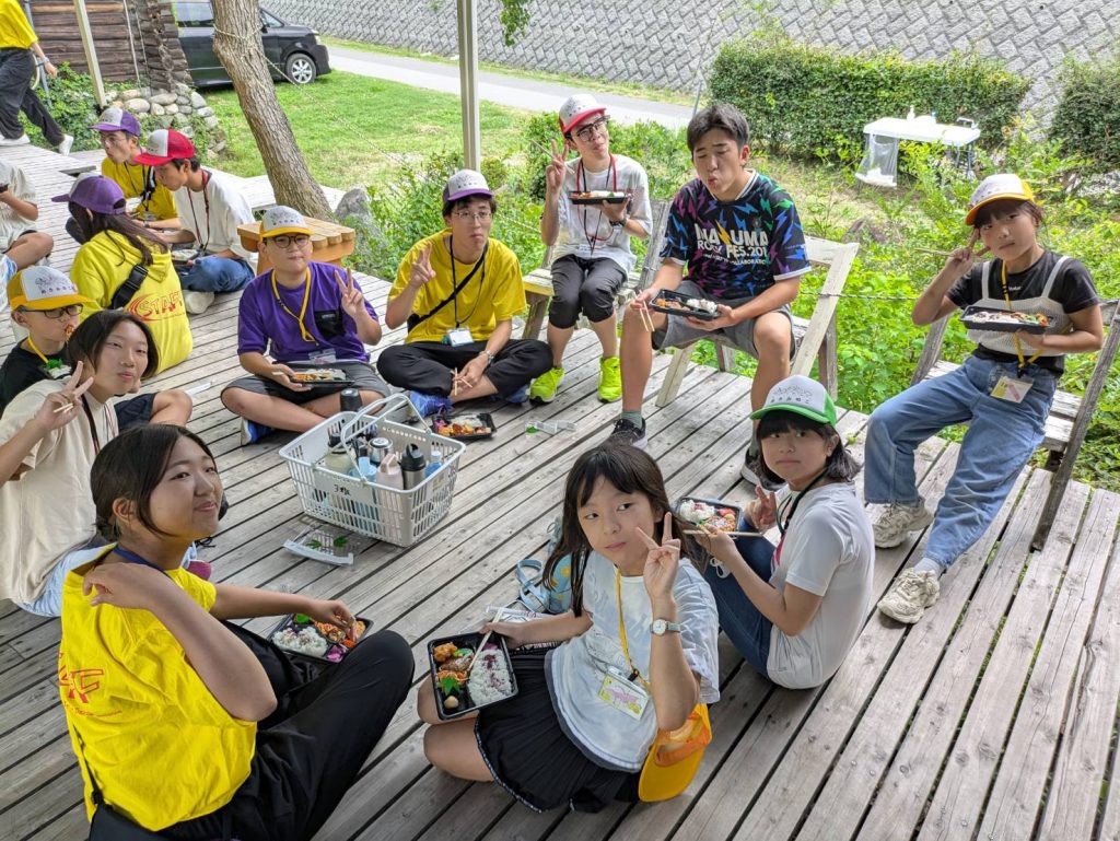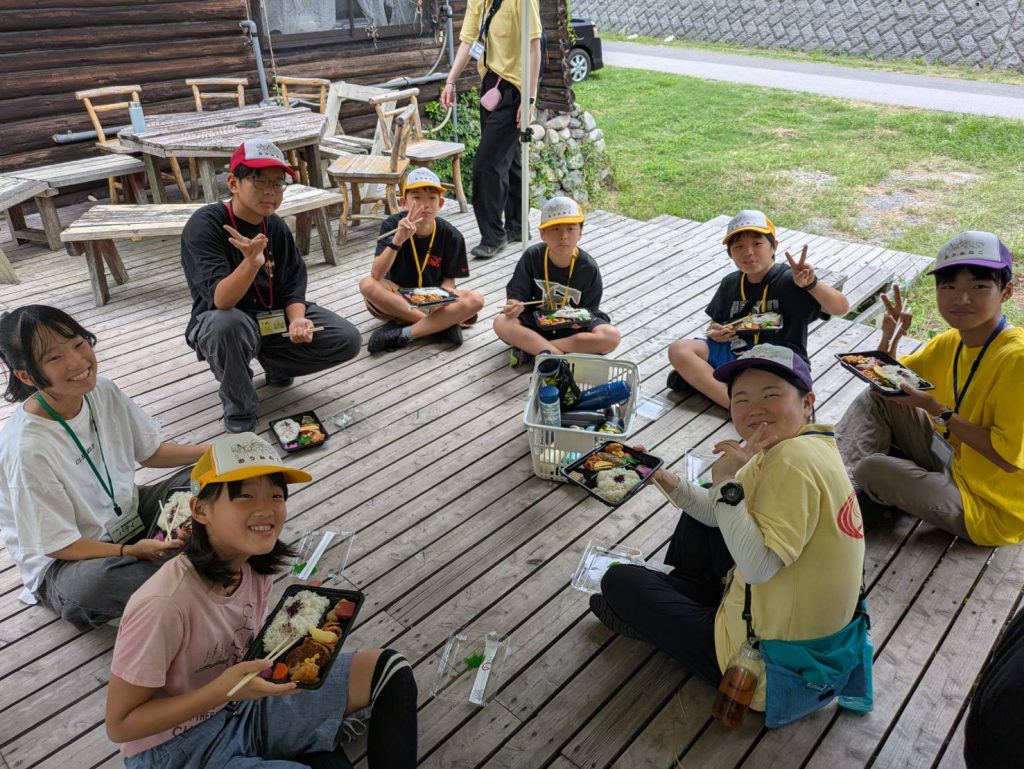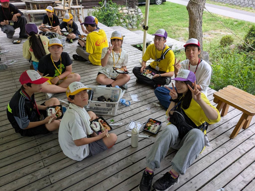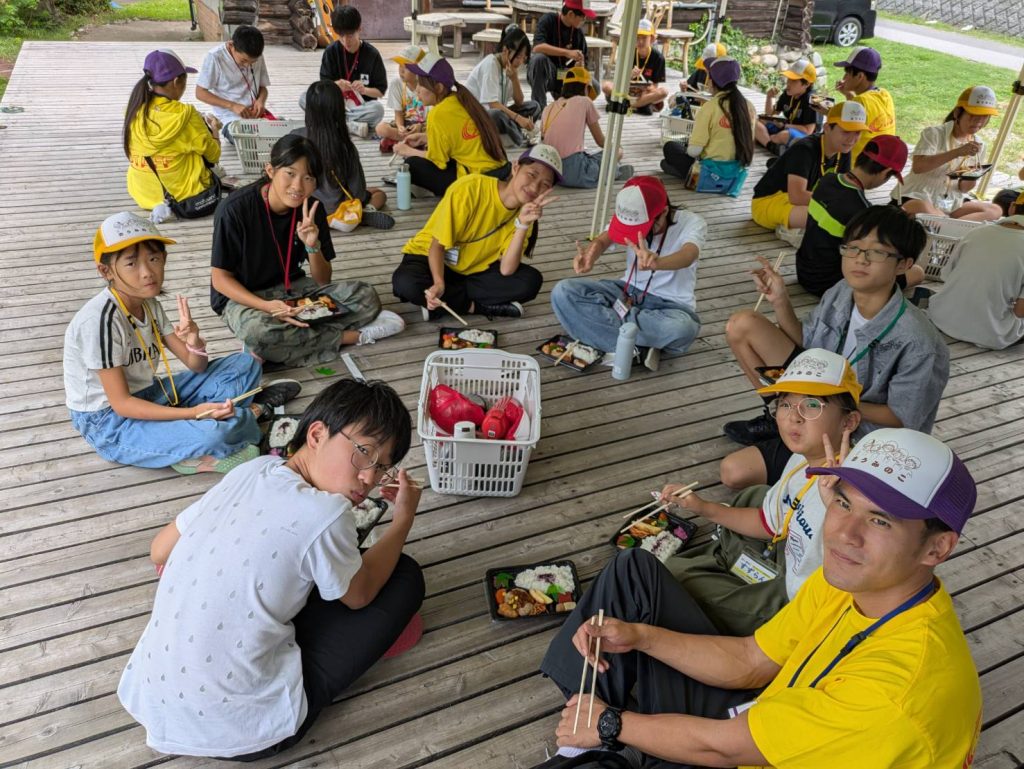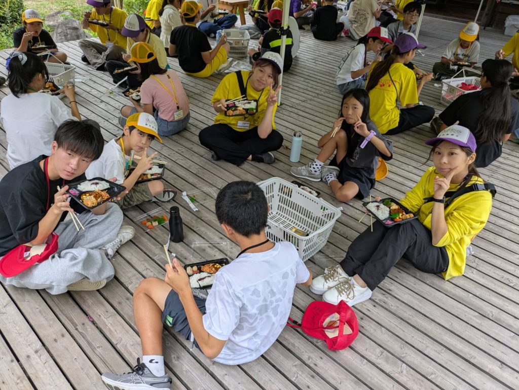 みんなでお昼ご飯!色んなゲームを通じて仲が深まったね。午後も元気に動けるようにエネルギーをつけよう!