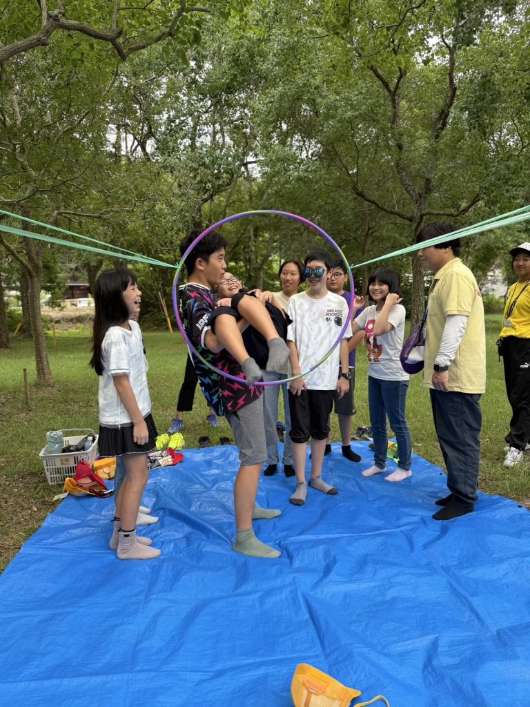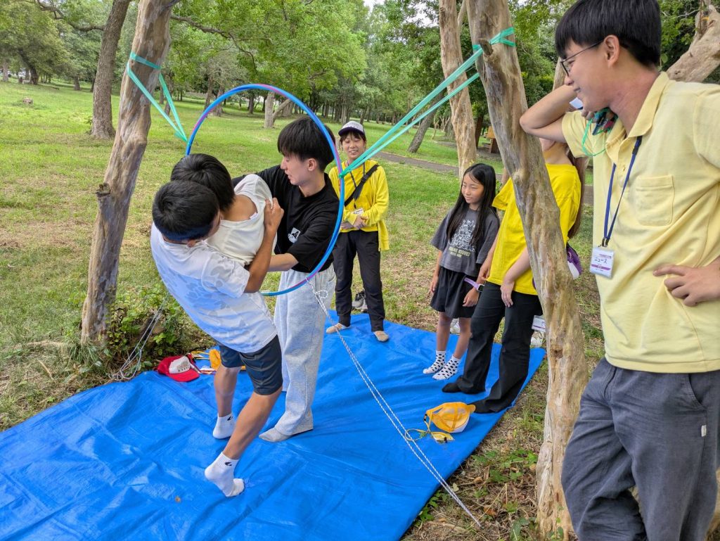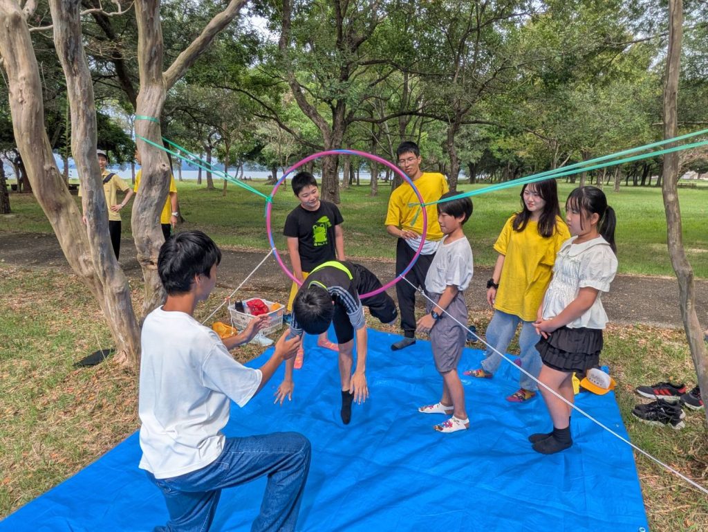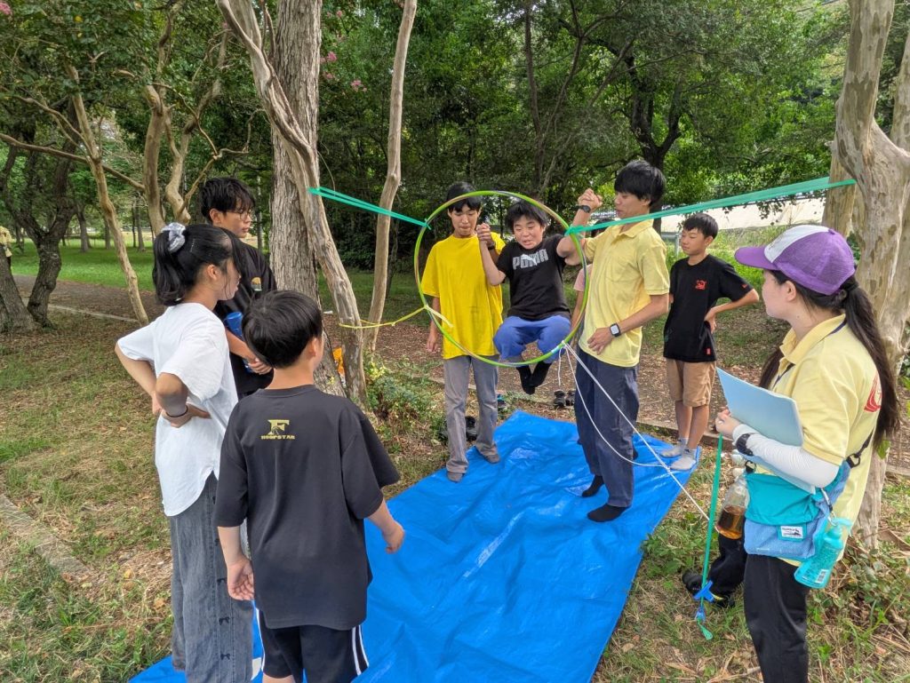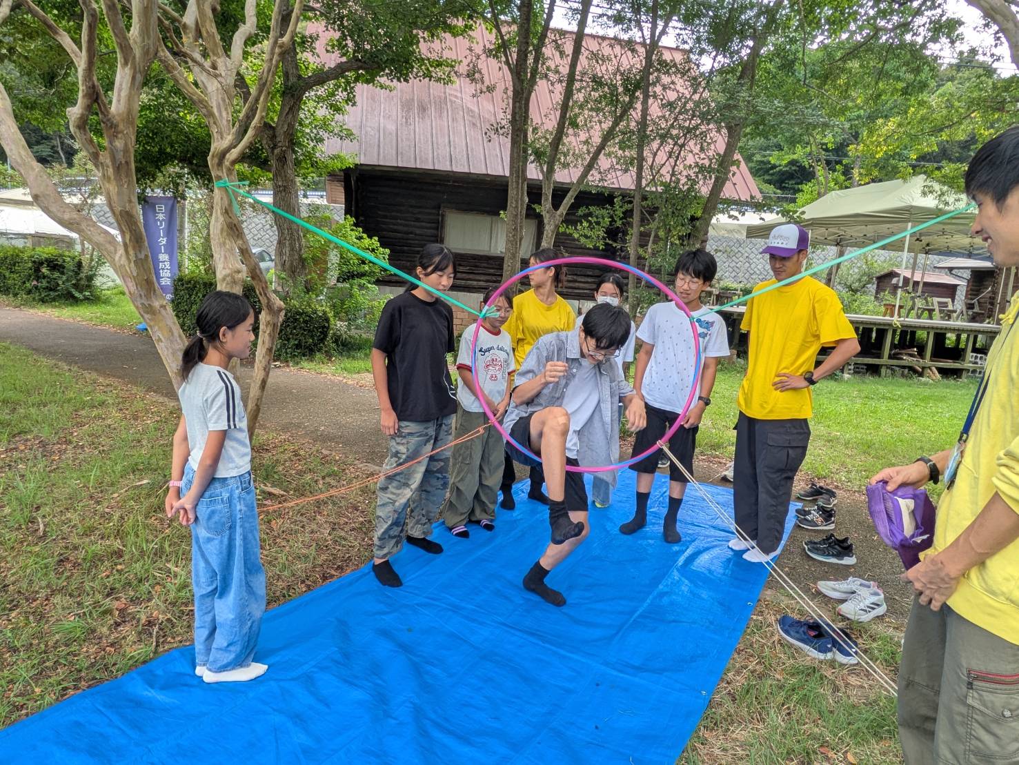 フラフープに触れずに班全員が通り抜けることが出来るかな?色々な方法を試してクリアを目指そう!