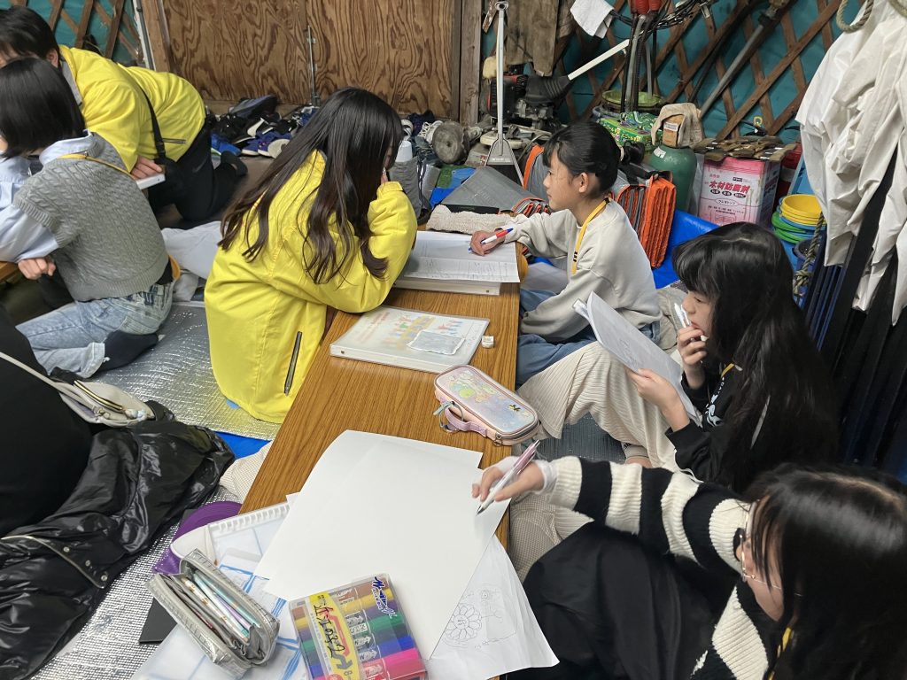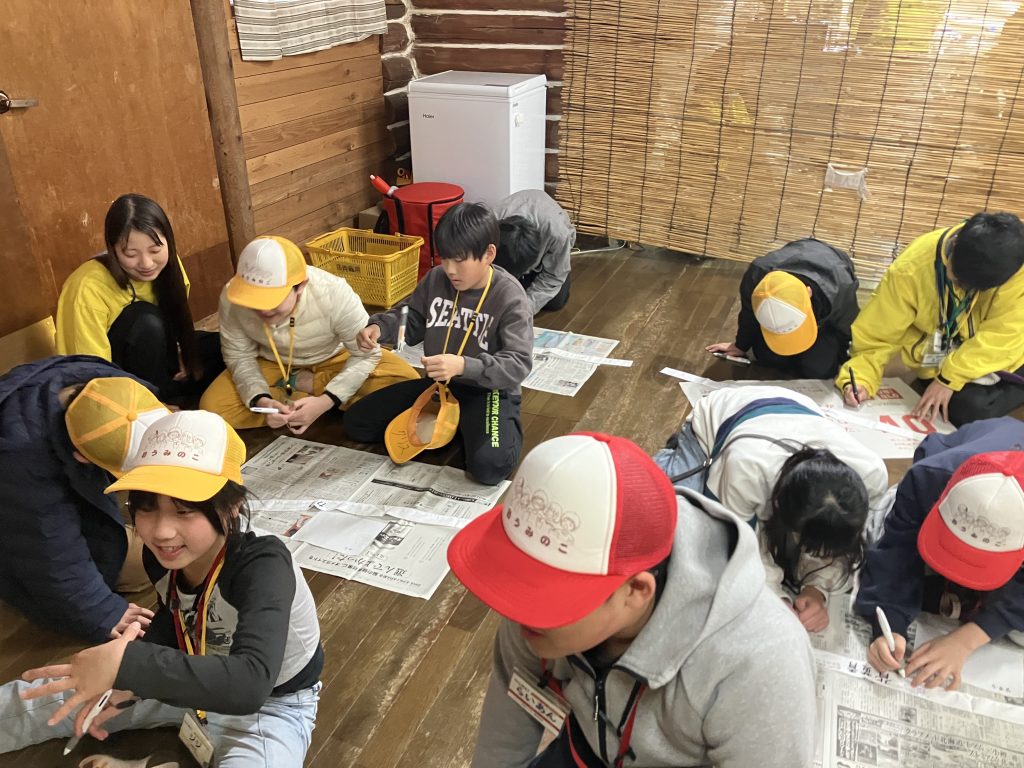 おつ会チームの作戦会議が始まりました!おつ会チームは、2日間頑張る芽歩輝チームのために、おつかれさま!の気持ちを届けます。どんな作戦にするか、大きなワークシートを囲んでみんなで考えよう🤔💭